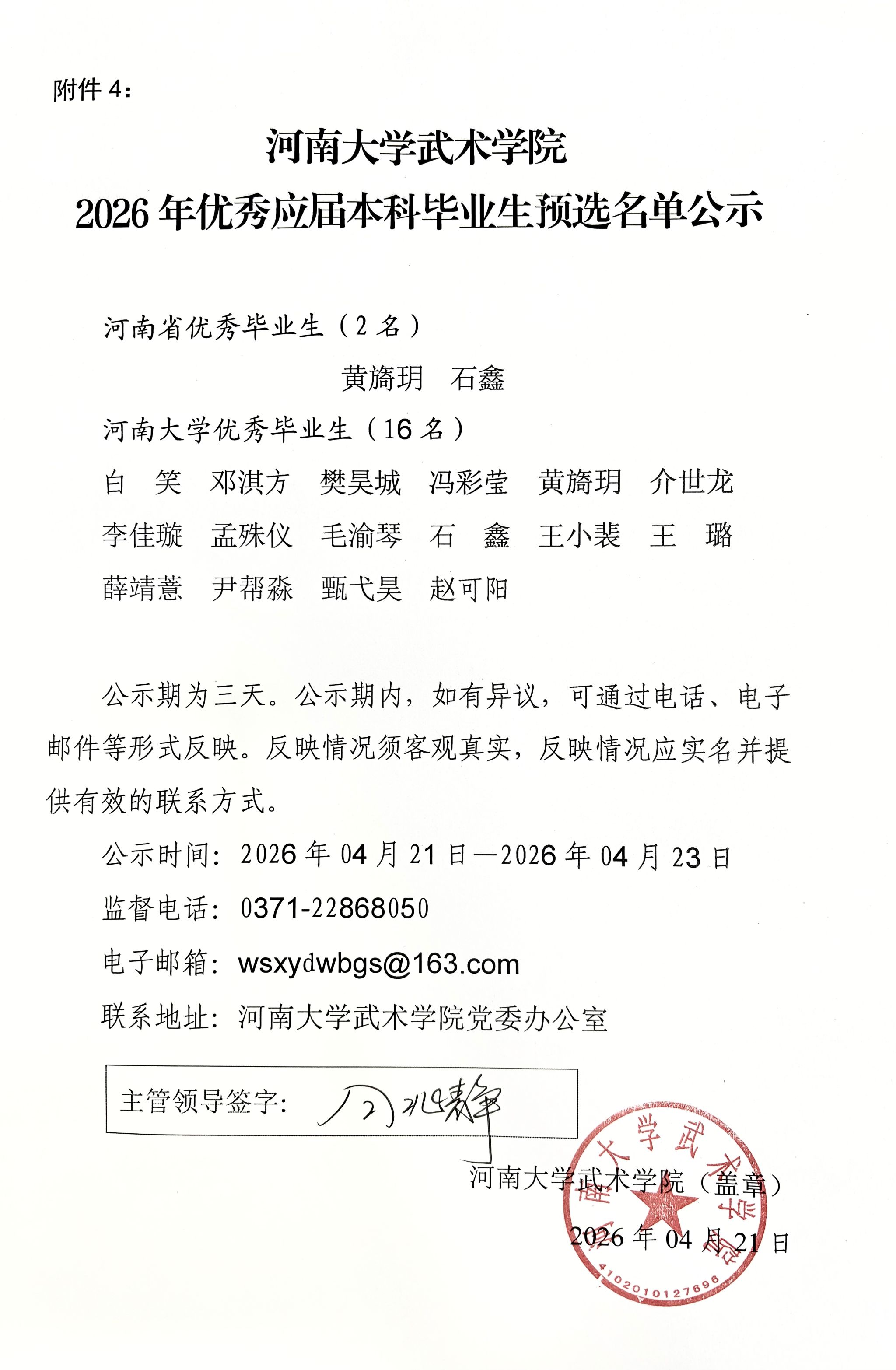 武术学院2026年优秀应届本科毕业生预选名单公示