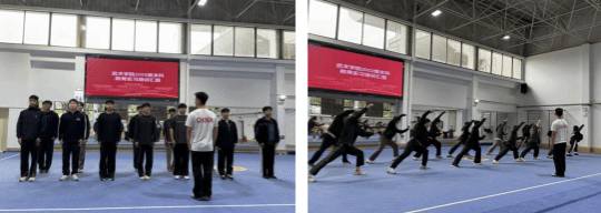 本次汇报表演由孙思哲、张伏伟、李嘉雨、陈彦召、李现臣、张铁刚等多位教师及河南大学附属小学石老师担任评委。22级同学们分组依次展示队列队形(含原地间转法、行进间转换)、广播体操《英雄少年》《旭日东升》、岳家拳一段、少林十三拳等多项内容。他们动作精准、精神饱满,展现出扎实的武术功底和良好的师范素养,赢得了评委的频频赞许和现场阵阵掌声。