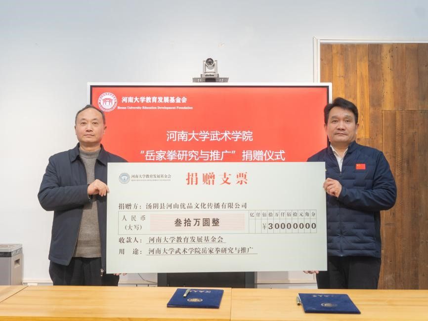 仪式现场,捐赠方代表、汤阴县岳飞文化促进会副会长李艳军与我院院长洪浩共同签订了捐赠协议。随后,洪浩院长代表学院接受捐赠,李艳军副会长向学院授予了30万元人民币的捐赠支票牌,标志着双方在岳家拳传承与推广领域的合作正式启动。