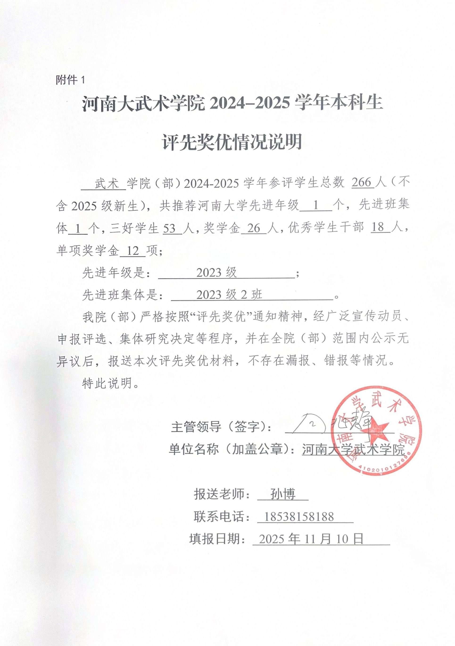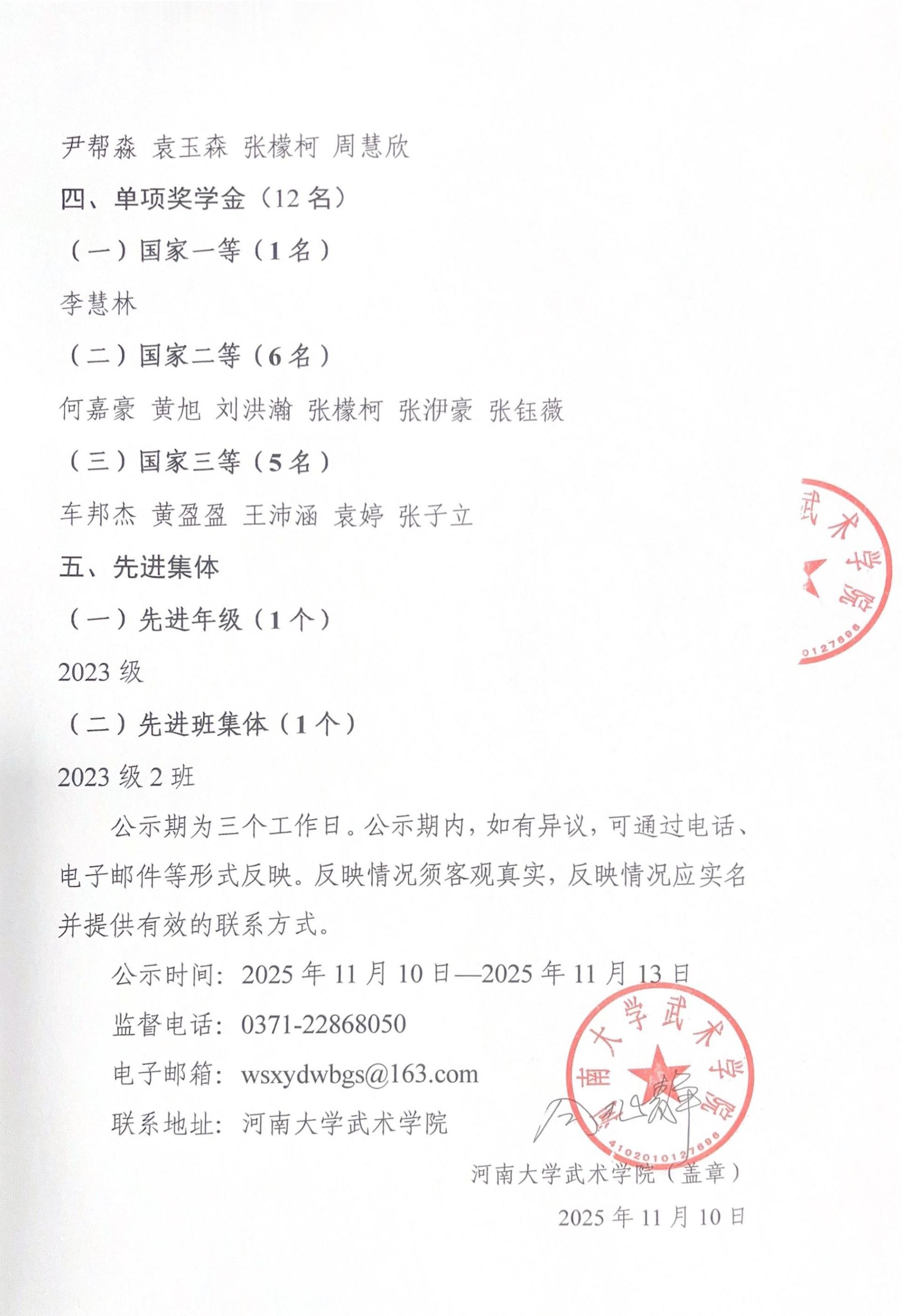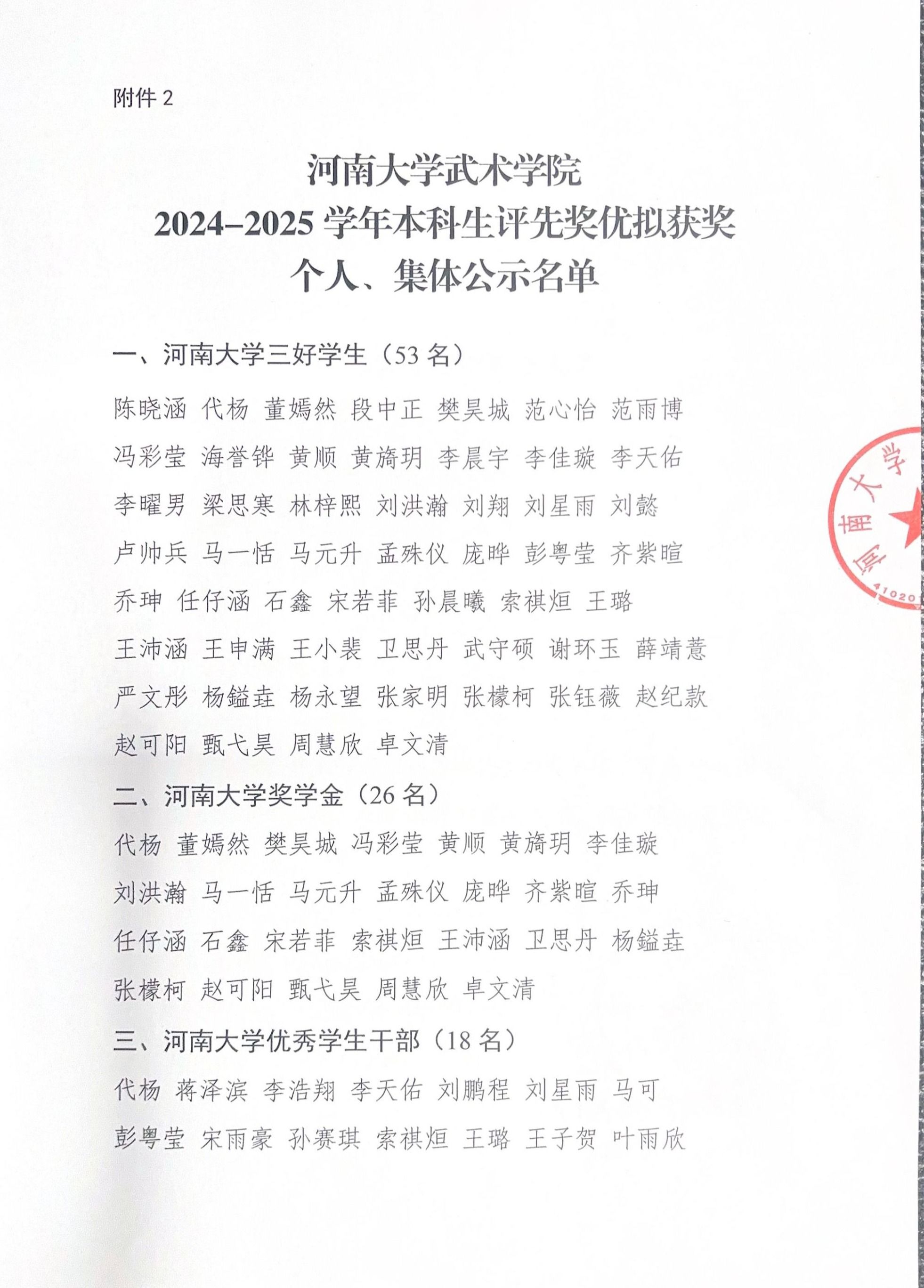 河南大学武术学院2024-2025学年本科生评先奖优拟获奖个人、集体公示名单